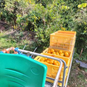 今日、収穫したポンカンのコンテナを、モノラックに積んでいる様子です。